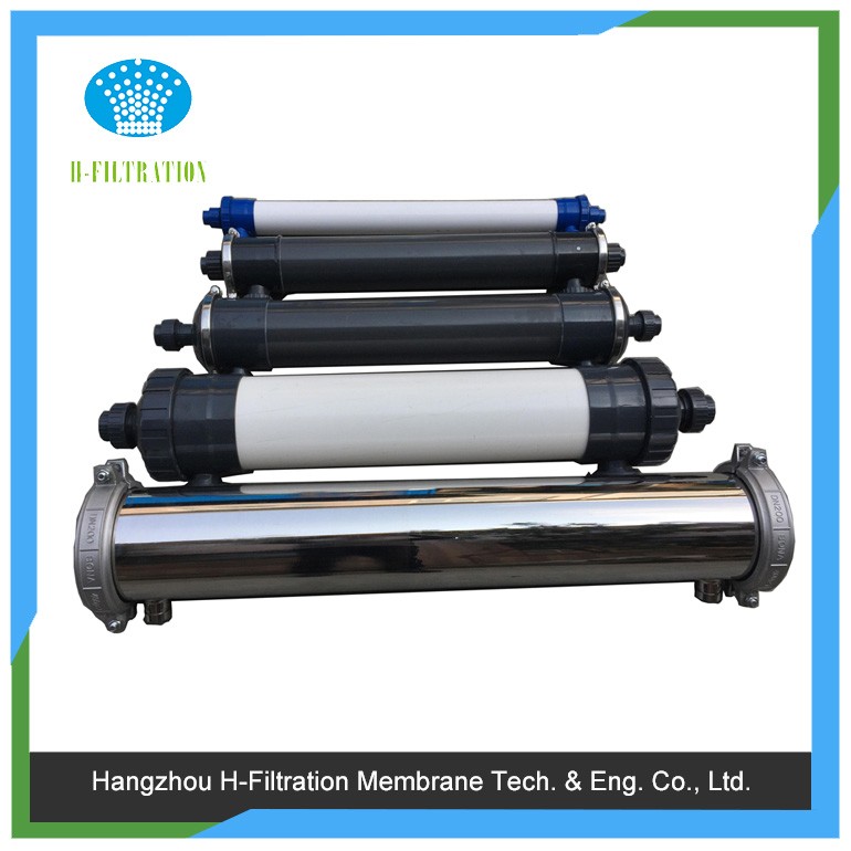 本品為外壓式超濾膜組件,根據(jù)膜組件外壁的箭頭方向,箭頭指向的端口是超濾透過液出口,下端是原液進口,側(cè)面兩個端口是排濃(回流)口;